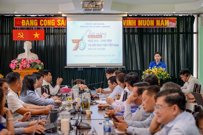 Nhân kỷ niệm 76 năm Ngày truyền thống Học sinh, Sinh viên Việt Nam và Hội Sinh viên Việt Nam (09/01/1950 – 09/01/2026) và kỷ niệm 18 năm Ngày thành lập Hội Sinh viên Việt Nam Trường Đại học Tài chính – Marketing (10/01/2008 – 10/01/2026), Đảng ủy – Ban Giám hiệu Trường Đại học Tài chính – Marketing đã tổ chức gặp mặt, tặng hoa chúc mừng và gửi lời động viên đến toàn thể cán bộ Hội, hội viên và sinh viên Nhà trường.