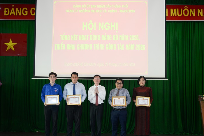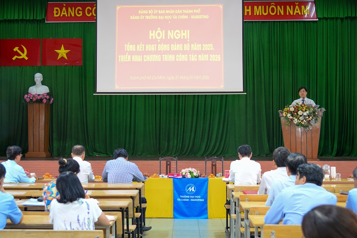 Chiều ngày 21/01/2026, Đảng bộ Trường Đại học Tài chính – Marketing đã tổ chức Hội nghị tổng kết hoạt động Đảng bộ năm 2025 và triển khai chương trình công tác năm 2026. Hội nghị có sự tham dự của Lãnh đạo Đảng ủy UBND TP.HCM, Ban Chấp hành Đảng bộ, cấp ủy các chi bộ trực thuộc cùng toàn thể đảng viên trong Đảng bộ Nhà trường.